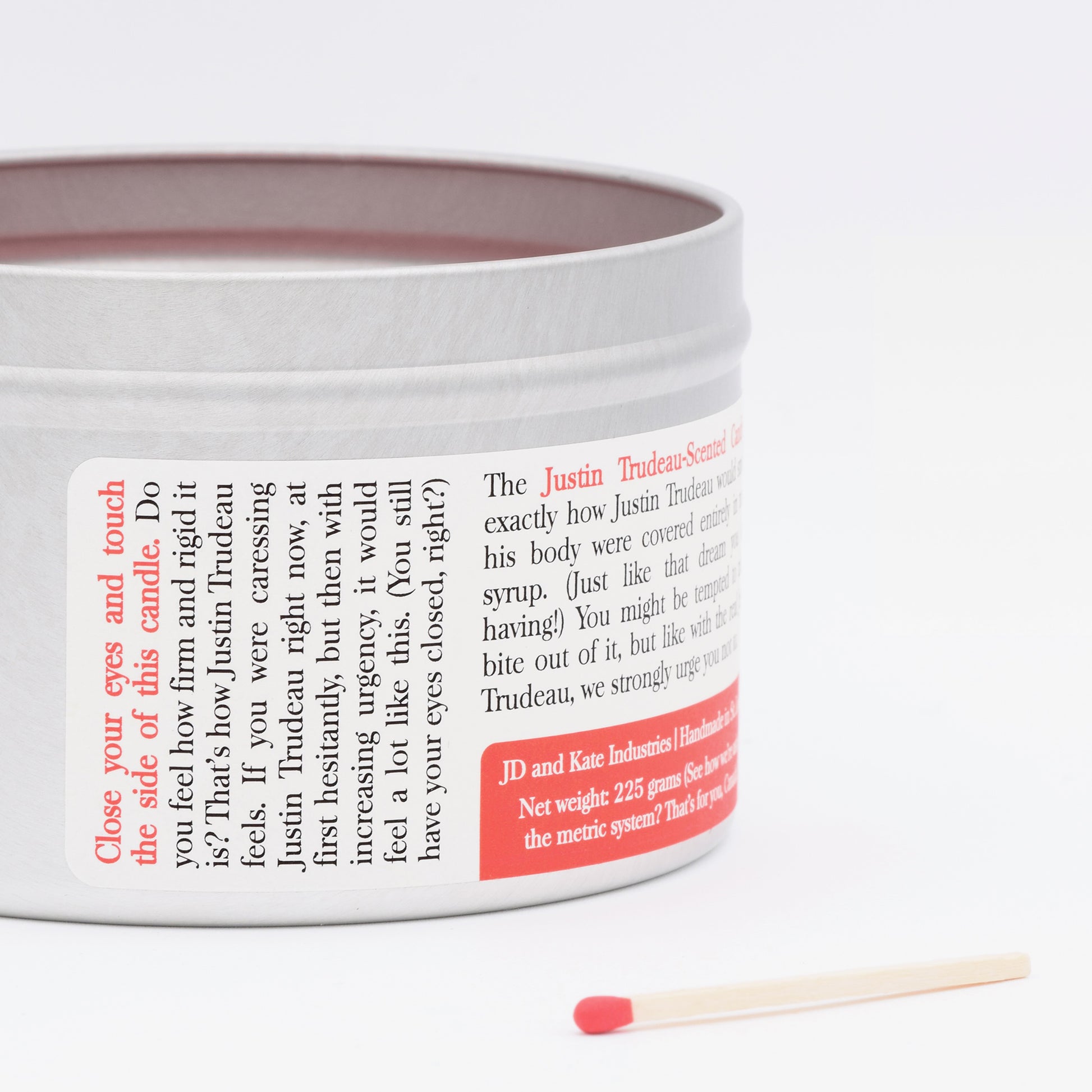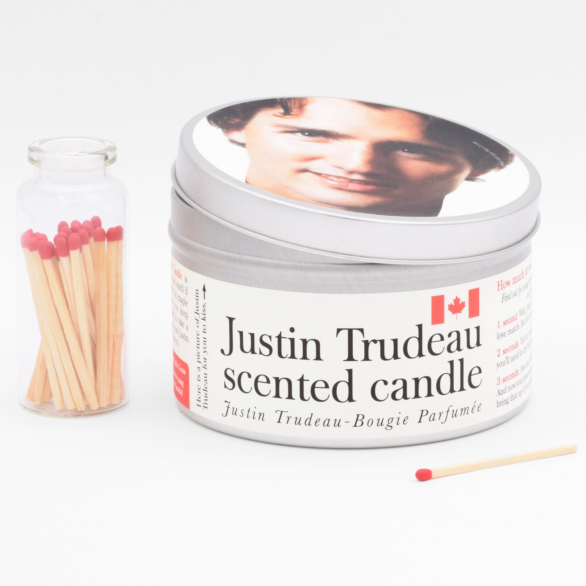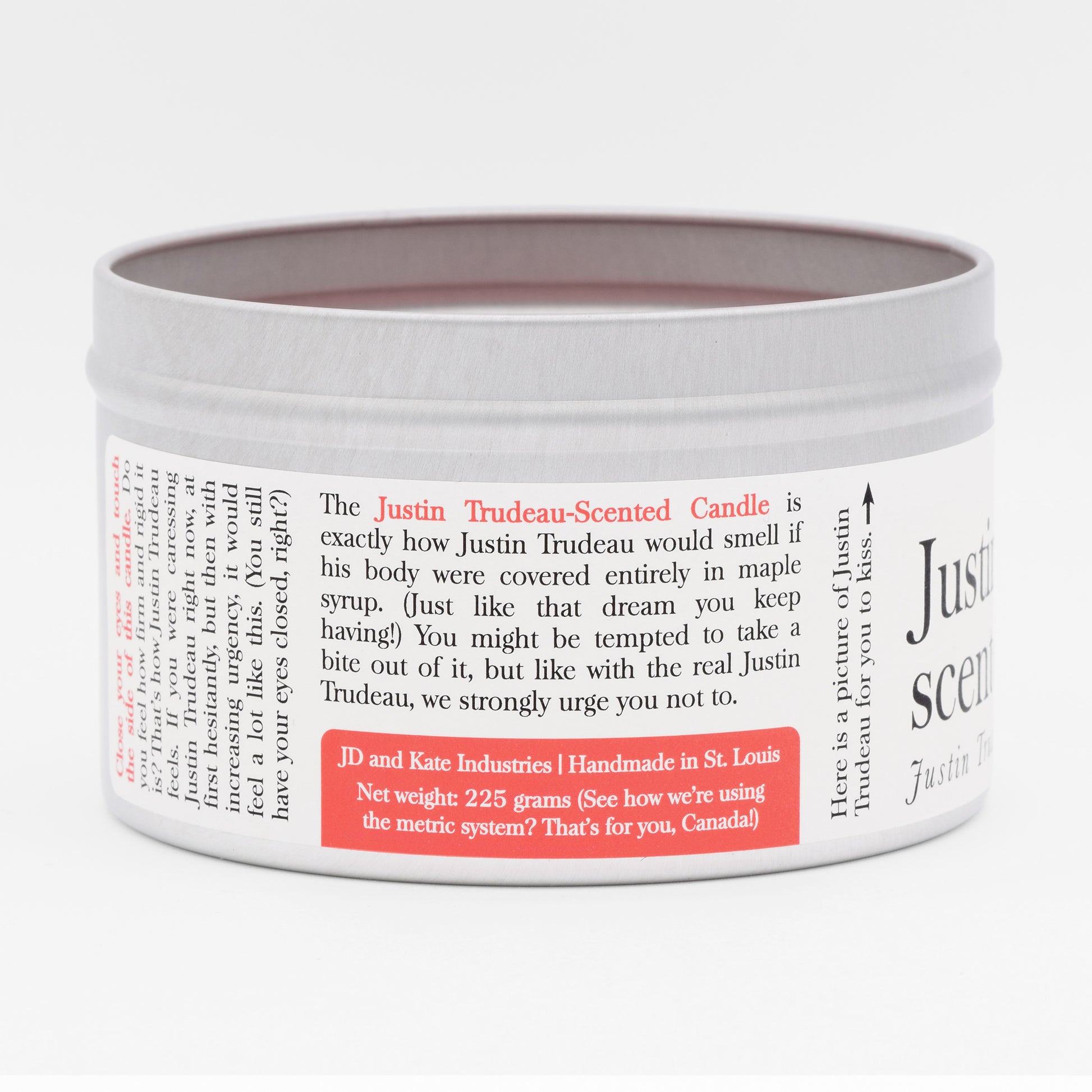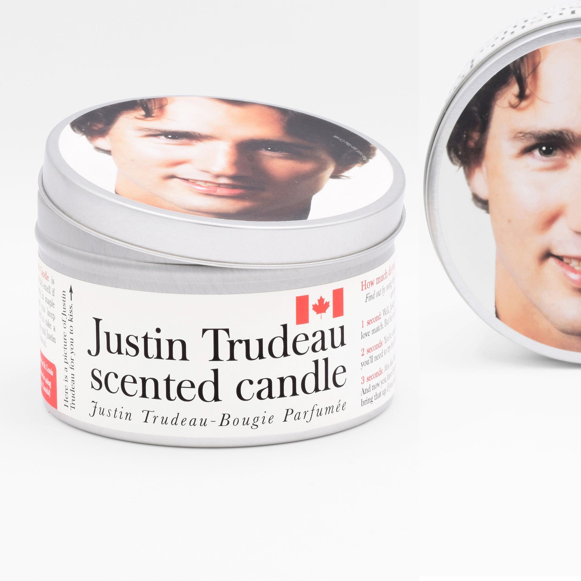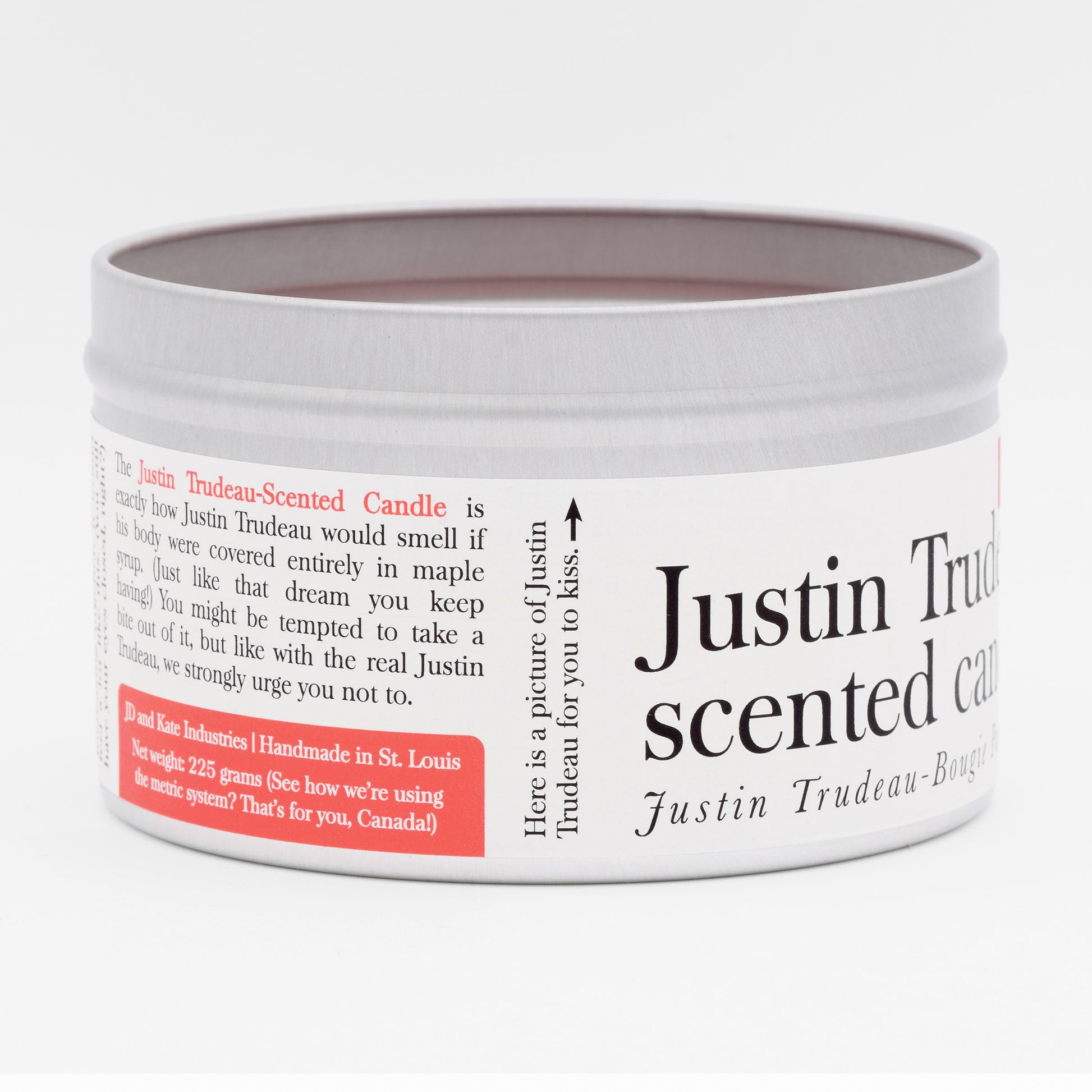 The 16 oz tin container bears Trudeau’s beaming face on the lid, perfect if you have always wanted to kiss a slightly miniaturized version of Justin Trudeau (or if you have always wanted to kiss a candle lid). It makes a great gift for anyone who is attracted to men, or Canadians, or both. And that's a Venn diagram that includes every single person you know!