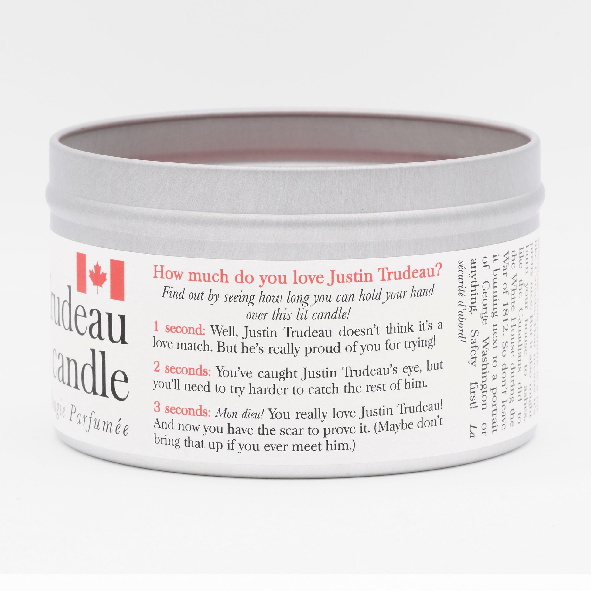 Purchased this as a gift for some Canadian friends. Love the description! Especially since they are not Trudeau fans! Just one of your clever candles!