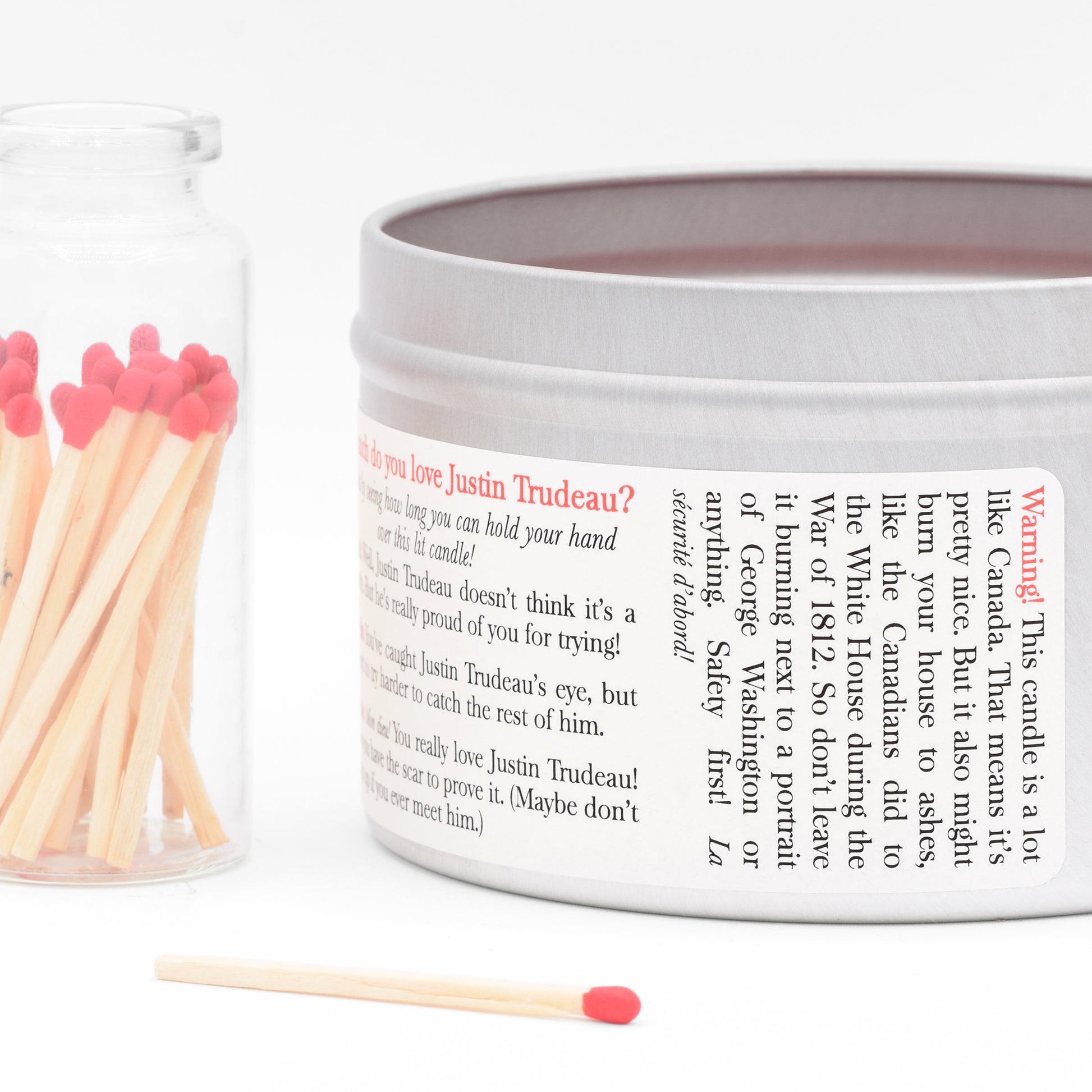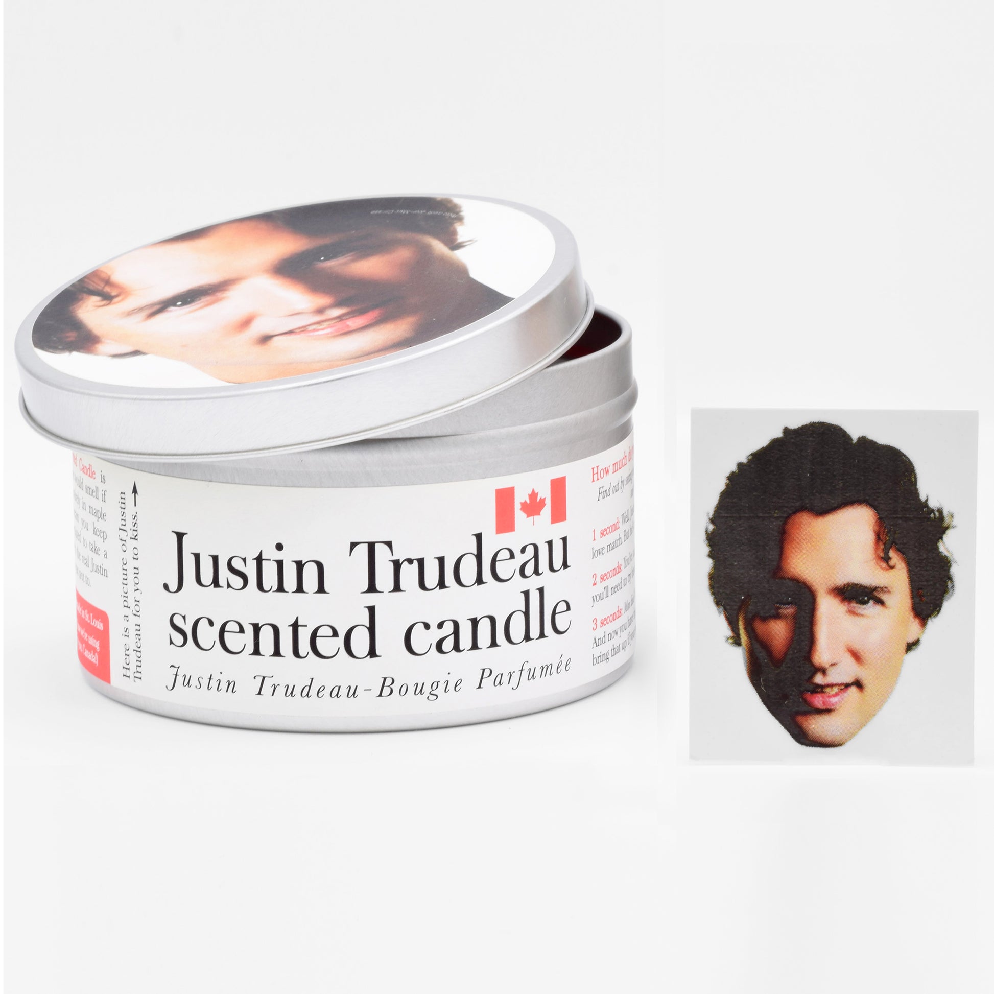 Each Justin Trudeau-Scented Candle comes with a Justin Trudeau temporary tattoo! Apply it wherever you’d like to have Justin Trudeau’s face pressed against your bare flesh. Your neck? Your foot? Your forehead? Sure, why not! If nothing else, it will be a conversation-starter around the office.